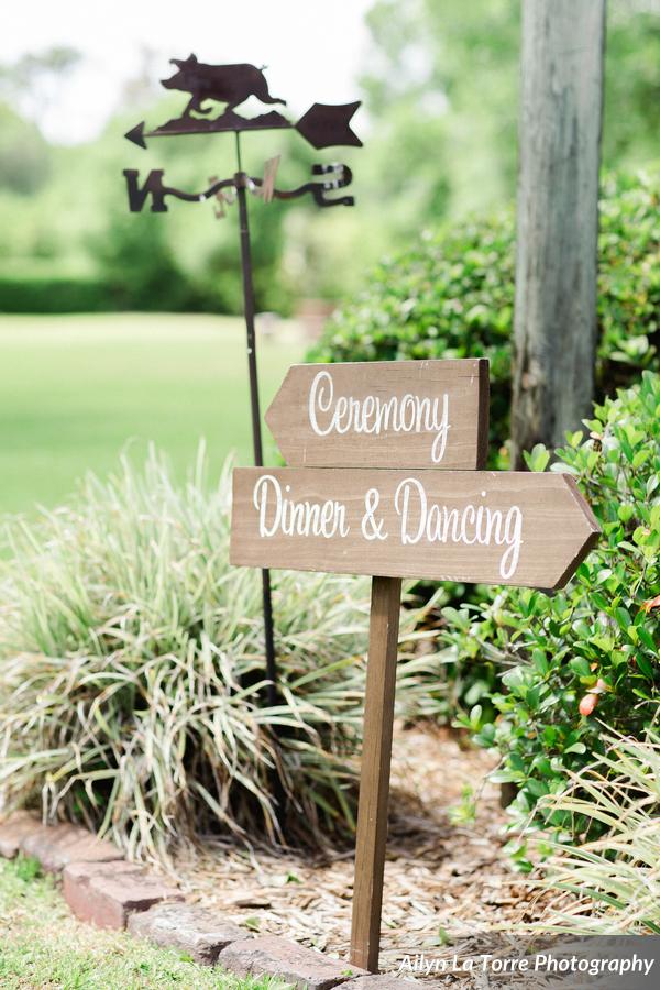 - Signage to specify locations. Have you ever been a wedding guest and had no clue where the reception was? Or maybe the layout of the venue was confusing? This is where signage can come in very handy. As the host, you want to ensure that guests are not struggling to find parking or the actual ceremony/reception site. Pro tip: Create easy to read signs. We love beautiful calligraphy but when it comes to signage, we suggest keeping it clean and simple. We thought these rustic wood arrows were a sweet little touch for an outdoor wedding. You can’t go wrong with a simple easel sign either!