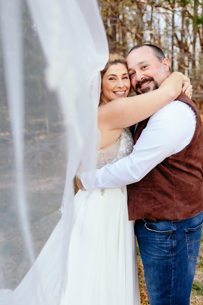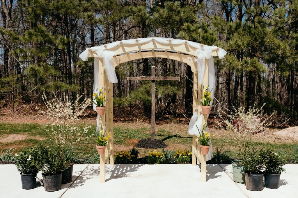 It was a beautiful sunny day with blue skies and not a drop of rain! The ceremony site was a pretty wooded area on the couples’ own property. The hand carved arbor was hand crafted by groom Ben’s uncle. We really loved the addition of flower pot holders with bright pops of color. Arbor rentals can easily cost hundreds of dollars but this was a gift to the couple! Price tag: zero dollars! The bride loves to garden so the subtle touch of daffodils on the arbor and in front of the cross was perfect. Our bride wanted to focus on more sustainable flowers so she opted for plants that could be added to their yard! Buying plants versus a wedding floral arrangement was a cost effective way to add color without breaking the bank!