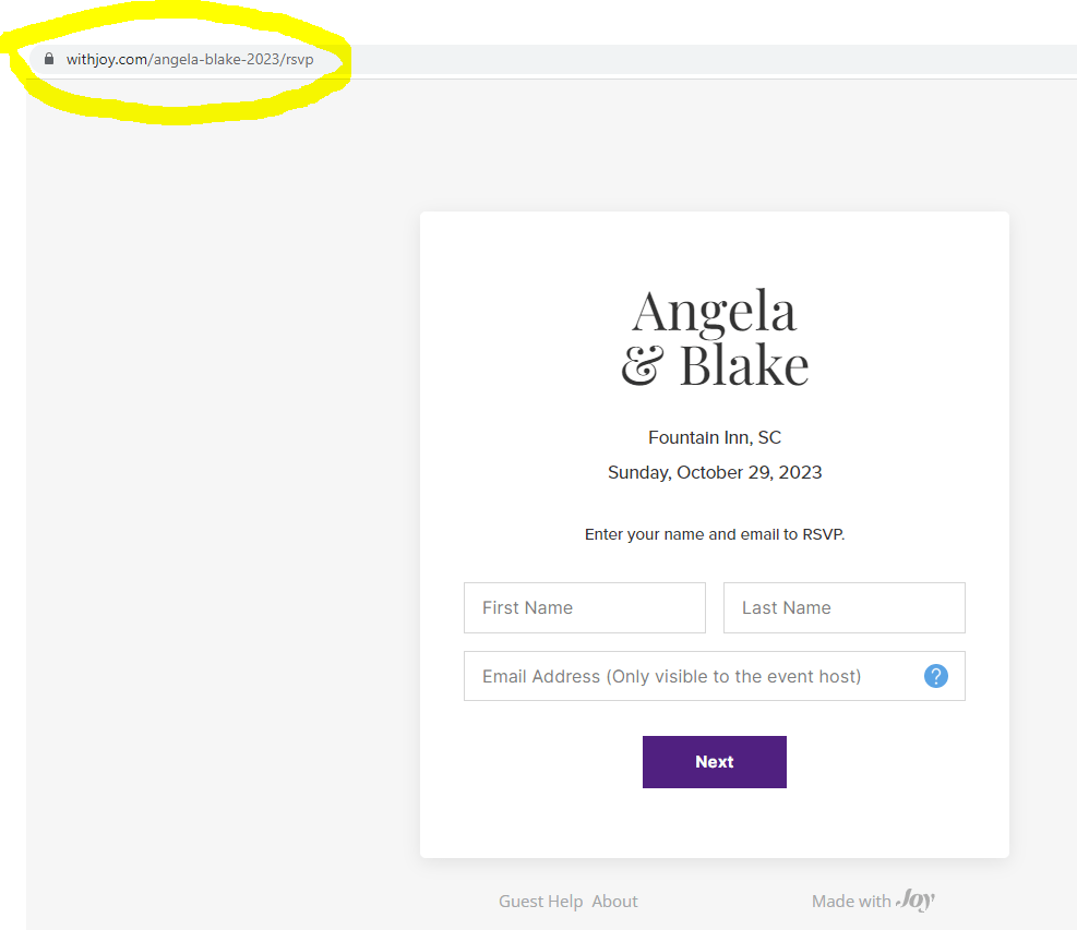 Before you create the actual QR code, you will need to a wedding website. The wedding website will serve as the link that guests will go to. You can use a variety of free services that offer wedding websites that you can customize! Once you create the website, you will need to copy the url of the RSVP page which can look like this: